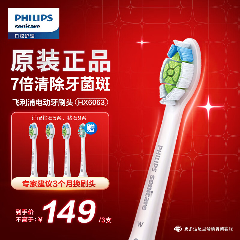 飞利浦(PHILIPS)电动牙刷刷头 钻石亮白型刷头W2 HX6063/67 3支装 白色 适配钻石5系、9系价格:149.00元!