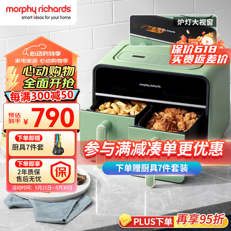 摩飞电器(Morphyrichards)空气炸锅 家用8L大容量可视双炸篮多功能空气炸烤箱 炸薯条鸡翅机MR8100薄荷绿价格:890.00元!
