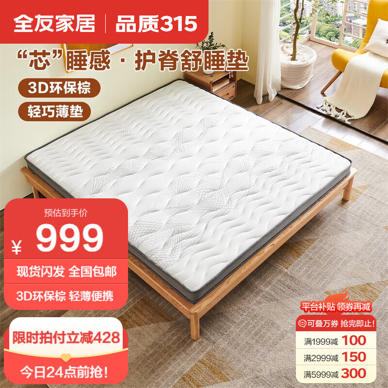 全友家居 3D椰棕床垫薄款偏硬 透气多功能榻榻米双人床垫子厚约10cm价格:998.90元!