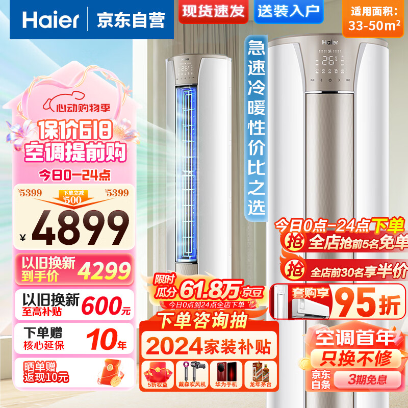 海尔(Haier)空调3匹3级能效静悦变频新能效客厅圆柱空调立式柜机自清洁 京东小家智能快速制冷智能物联72KCA83价格:4899.00元!