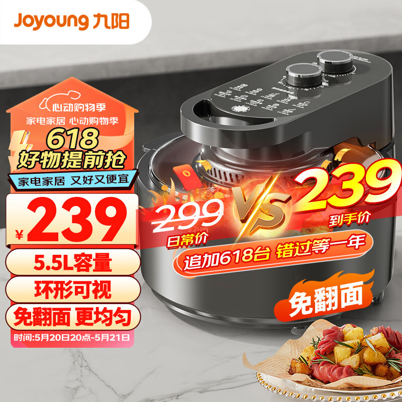 九阳(Joyoung)太空空气炸锅 不用翻面 可视窗口 5.5L大容量 家用多功能不沾易清洗 VF735价格:239.00元!