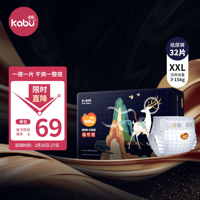 卡布KABU流光溢彩纸尿裤XXL码32片(≥15KG) 尿裤尿不湿 夜用安睡价格:69.00元!