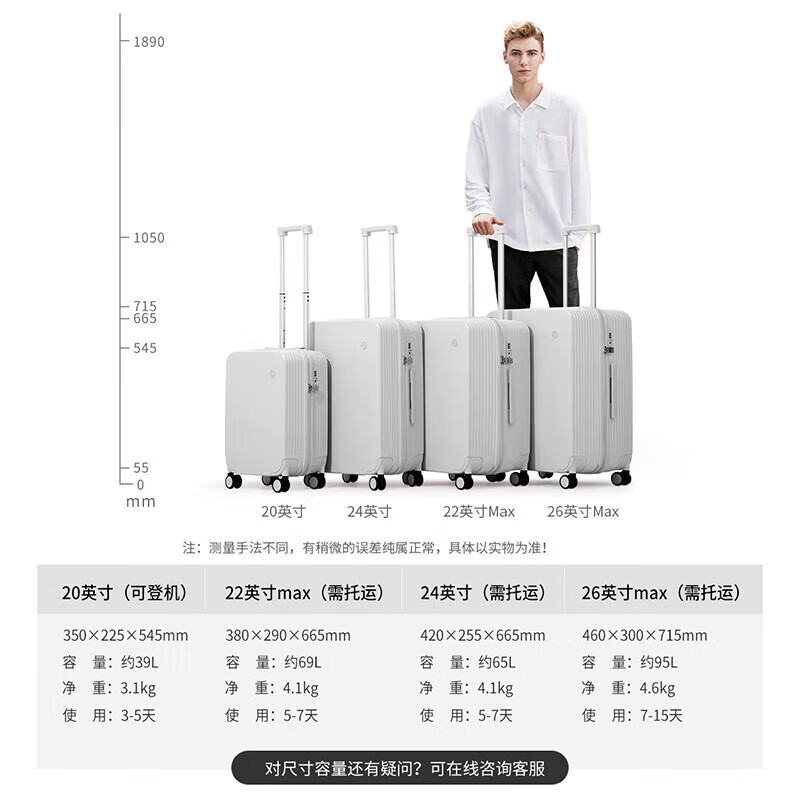 米熙高颜值拉杆箱子行李箱大容量托运箱男旅行箱包女学生22英寸烟白83价格:499.00元!