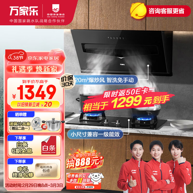 万家乐 抽油烟机 侧吸式烟灶套装20m3/min大吸力挥手自清洗油烟机高温防烫燃气灶套装DAJ3+KA032B天然气价格:1449.00元!