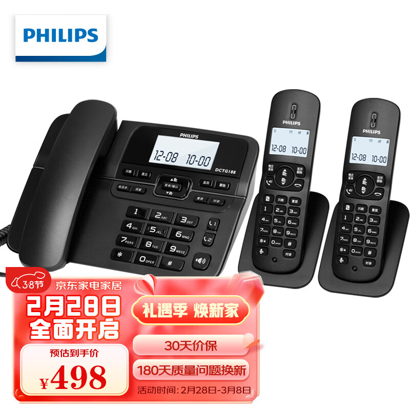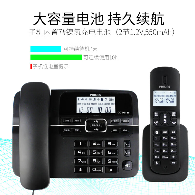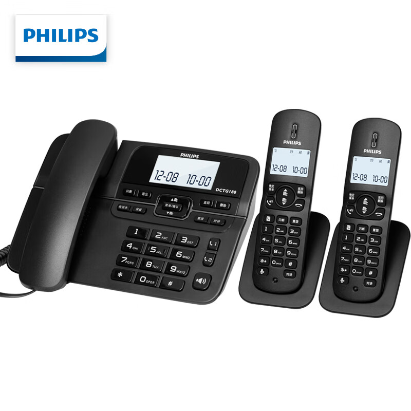 飞利浦DCTG188数字无绳电话机办公家用座机电话子母机免提/一键拨号/一拖二(黑色)HWDCD9889(188)TSD价格:449.00元!