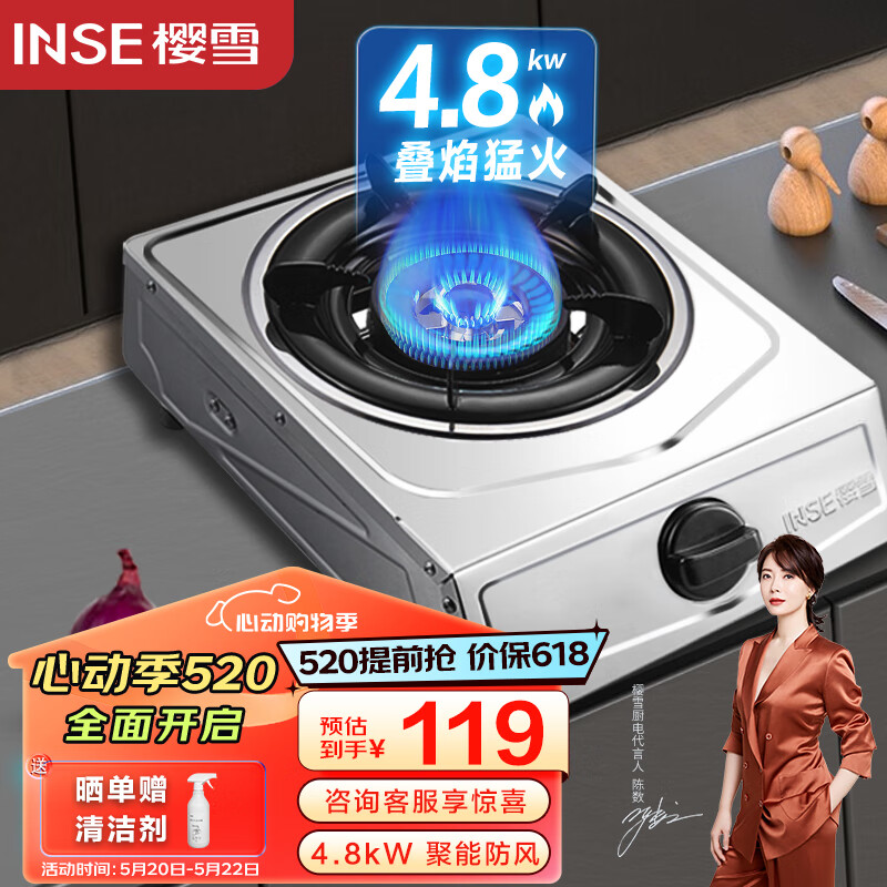 樱雪(INSE)燃气灶单灶 台式不锈钢面板4.8kW煤气灶单灶 家用猛火节能单眼灶 JZT-T1501(G)W天然气价格:118.00元!