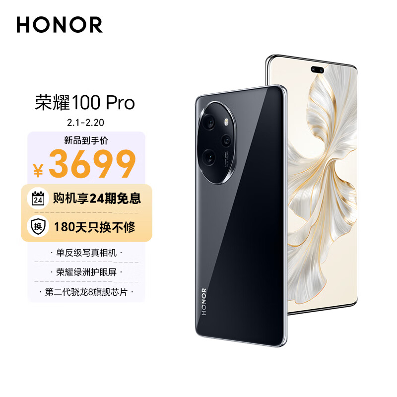 荣耀100 Pro 单反级主摄 荣耀绿洲护眼屏 第二代骁龙8旗舰芯片 立体声双扬声器 OIS 16+256 亮黑色 5G价格:3699.00元!