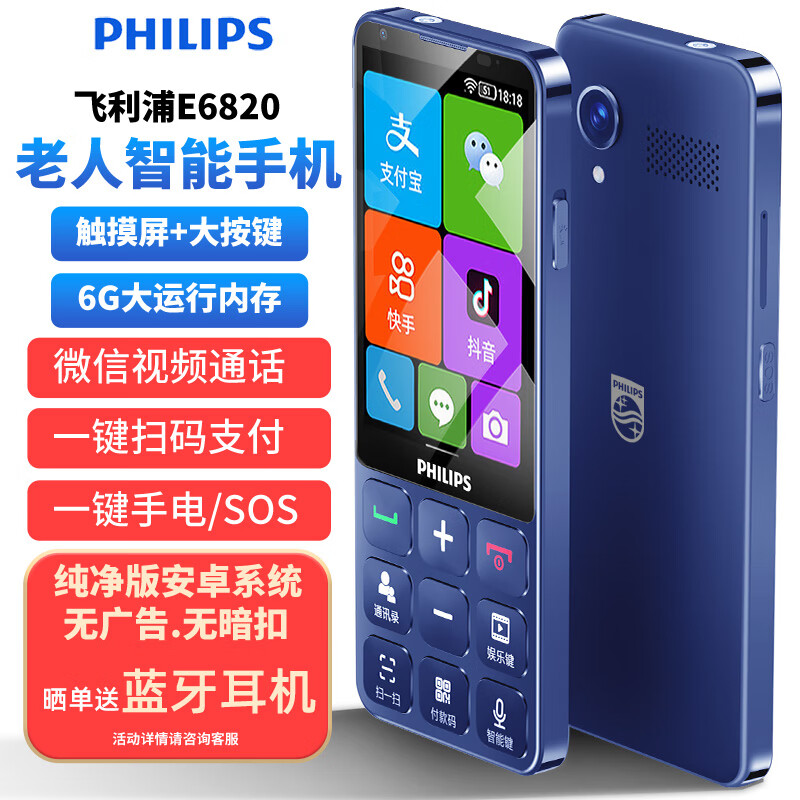 飞利浦(PHILIPS)E6820 宝石蓝 6+64G 智能老年人手机超长待机微信触屏按键 4G通 安卓防沉迷学生备用机价格:679.00元!