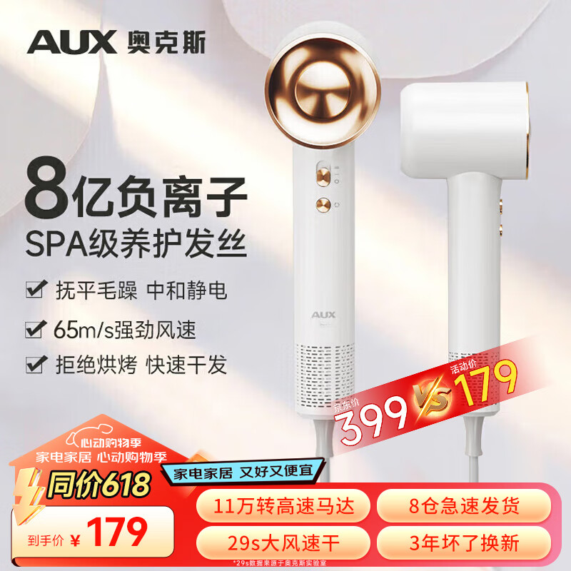 奥克斯高速吹风机家用电吹风负离子护发大功率理发店专用大风力速干无叶不伤发低音发廊款吹风筒生日送礼价格:179.00元!