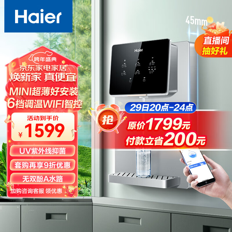 海尔(Haier)管线机 壁挂式饮水机 家用超薄无胆即热式直饮机厚膜速热 6档水温调节净水器伴侣HGR2291-JU1价格:1599.00元!