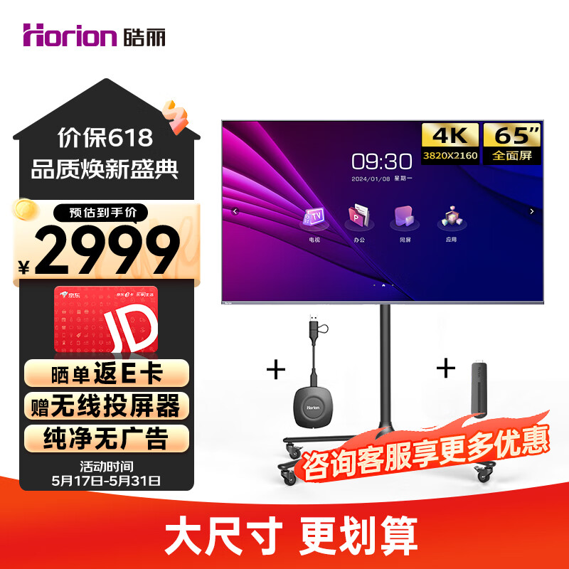 皓丽(Horion)65英寸会议平板电视一体机智慧屏投屏投影电视一体机商用显示会议室教学培训大屏65H5桌面底座价格:3099.00元!
