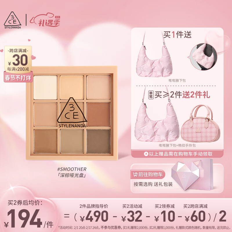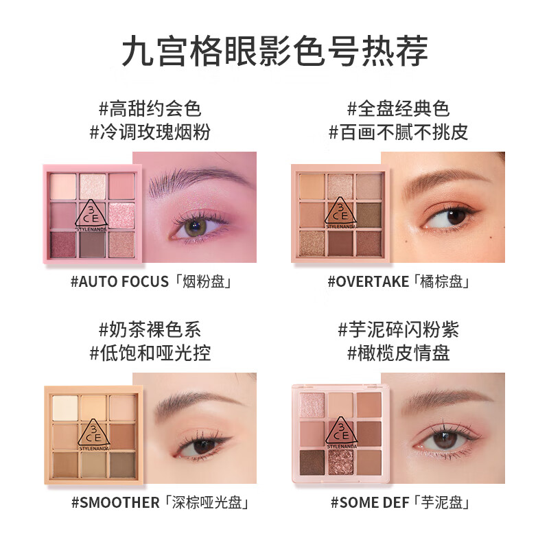 3CE九宫格九色纷呈眼影盘玫瑰柔情SMOOTHER深棕盘新年情人节礼物价格:229.00元!