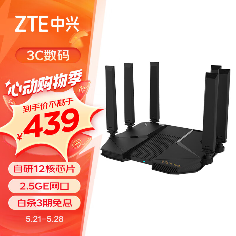 中兴(ZTE) AX5400Pro双频千兆 自研12核主芯片 2.5G端口mesh无线路由器 wifi6 电竞路由穿墙大覆盖价格:439.00元!