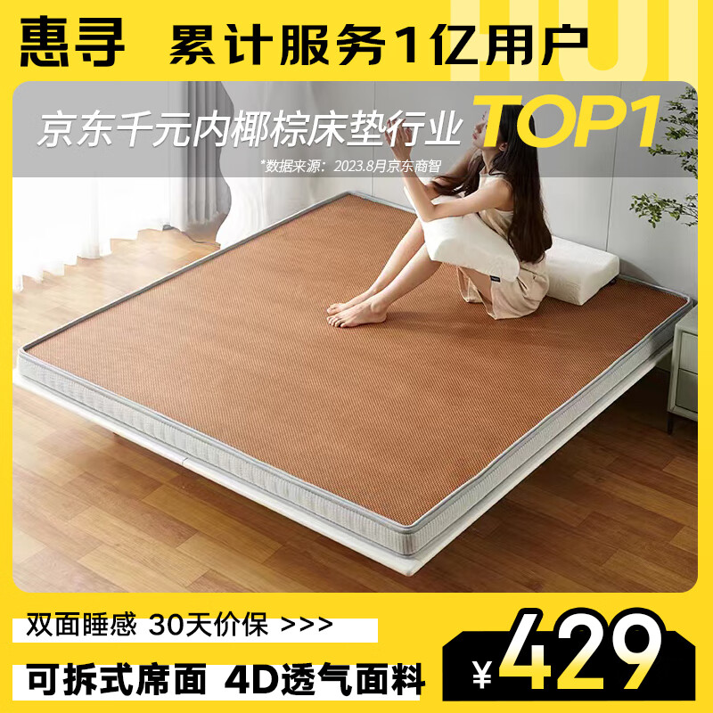 惠寻 京东自有品牌 凉席藤席椰棕床垫4D加厚双面硬棕垫10cm 1.5*1.9米价格:429.00元!