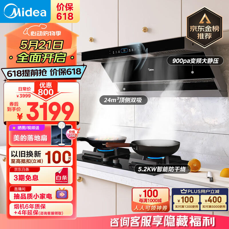 美的(Midea)抽油烟机燃气灶具家用顶侧双吸烟灶联动智控变频24风量大吸力超薄近吸烟灶套装DL5+Q518S天然气价格:3499.00元!