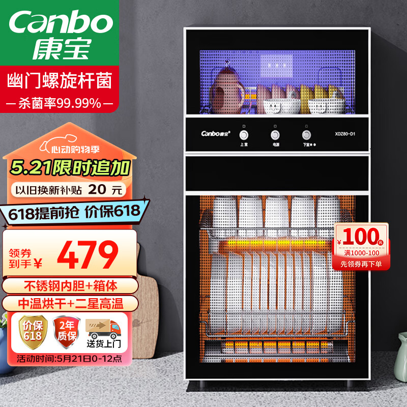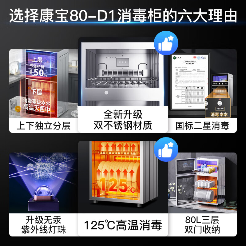 康宝(Canbo)消毒柜家用不锈钢小型立式 二星高温厨房餐具婴儿奶瓶碗筷子烘干双门80L三层收纳消毒碗柜XDZ80-D1价格:579.00元!