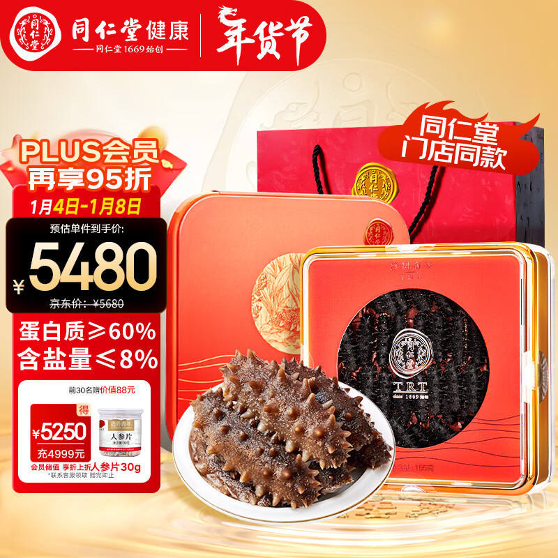 同仁堂(TRT)北京同仁堂大连淡干海参辽参净制155g25-31只海参干货过年礼盒价格:5480.00元!