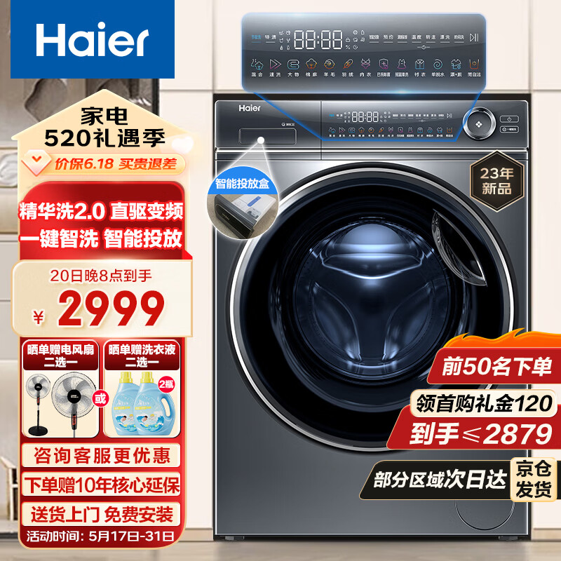海尔(Haier)【升级精华洗2.0】10KG滚筒洗衣机全自动直驱变频一级能效一键智洗+智能投放+除菌螨EG100BD66S价格:2999.00元!