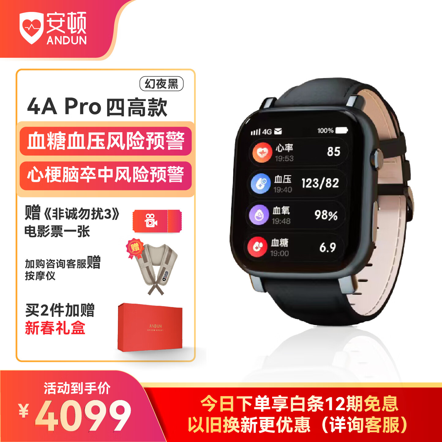 安顿健康预警手表4APro四高款血压血糖趋势监测血氧老人睡眠手环监测智能手表黑色价格:4819.00元!