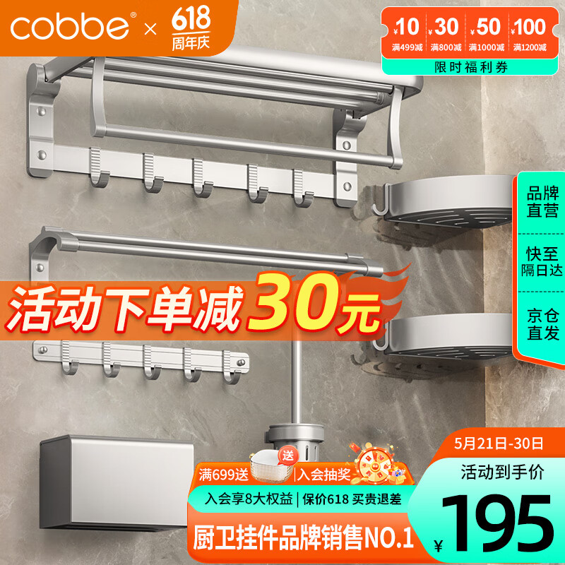 卡贝(cobbe)毛巾架免打孔卫生间置物架浴室太空铝浴巾架杆洗手间卫浴挂件套装价格:225.00元!