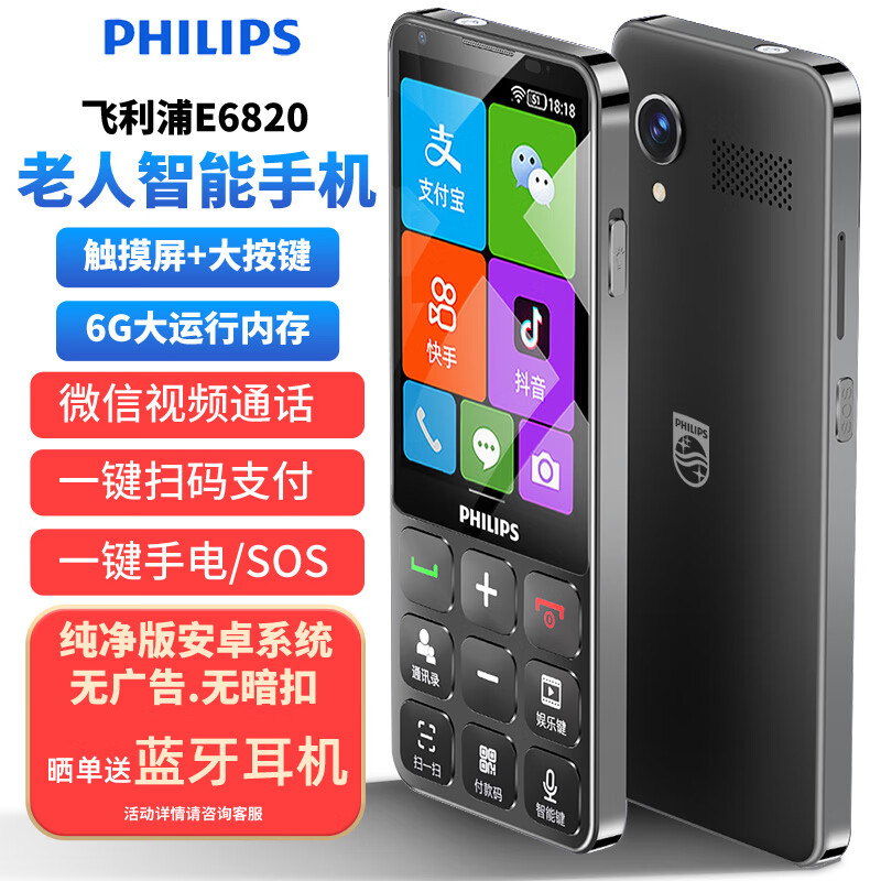 飞利浦(PHILIPS)E6820 老人智能手机 超长待机 触摸屏按键老年机 4G通双卡双待 64G学生备用机 星空黑价格:679.00元!