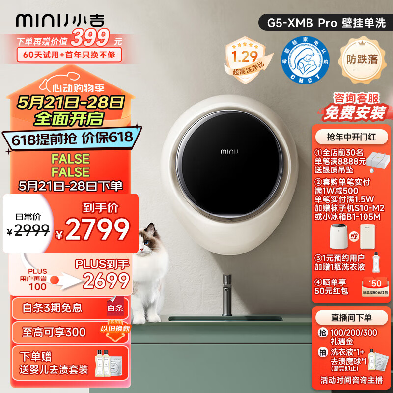 小吉(MINIJ)全自动母婴专洗直驱变频 防跌落 迷你机身1kg智能壁挂洗衣机 小水滴 G5-XMB pro价格:2999.00元!