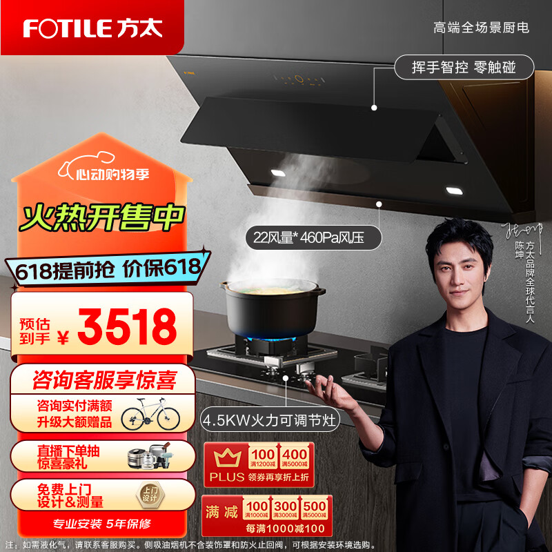 方太(FOTILE)抽吸油烟机灶具套装 侧吸式烟灶套装智能挥手 22大风量4.5kW双灶家用烟灶 JCD9A+02-TH33B天然气价格:3818.00元!