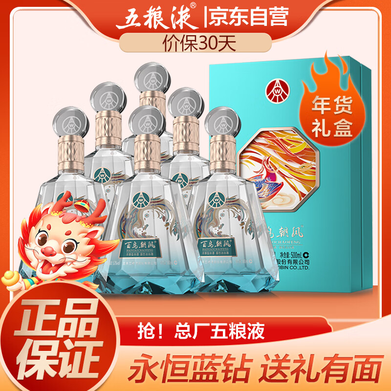 五粮液百鸟朝凤蓝钻浓香型白酒礼盒整箱6瓶52度500ml龙年货节日送礼酒水价格:1550.00元!