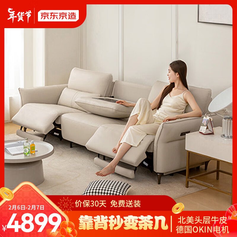 京东京造真皮沙发 靠背秒变茶几|头层牛皮|现代轻奢双电动 米色大三人SE13价格:5399.00元!