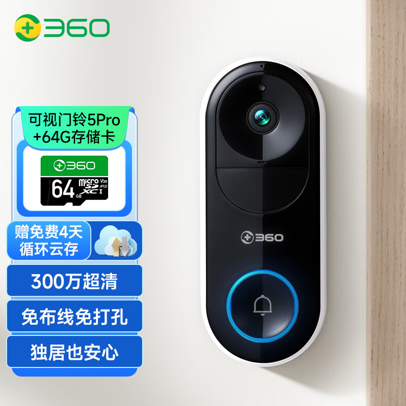 360 可视门铃5Pro摄像头家用监控摄像头智能摄像机 2K智能门铃电子猫眼 无线wifi 300W超清夜视AR1C价格:409.00元!
