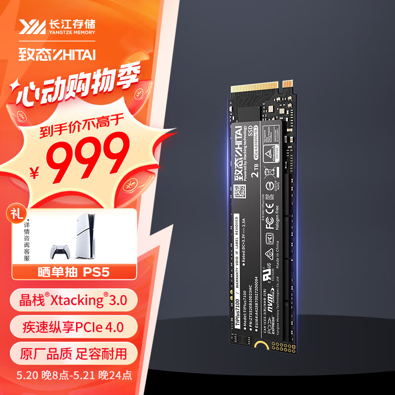致态(ZhiTai)长江存储 2TB SSD固态硬盘 NVMe M.2接口 TiPlus7100系列 (PCIe 4.0 产品)价格:999.00元!