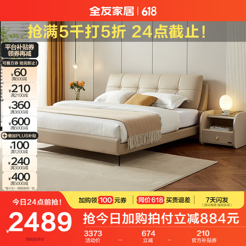 全友家居 真皮艺双人床现代简约主卧室头层牛皮软包床1.5x2米105135价格:3373.75元!