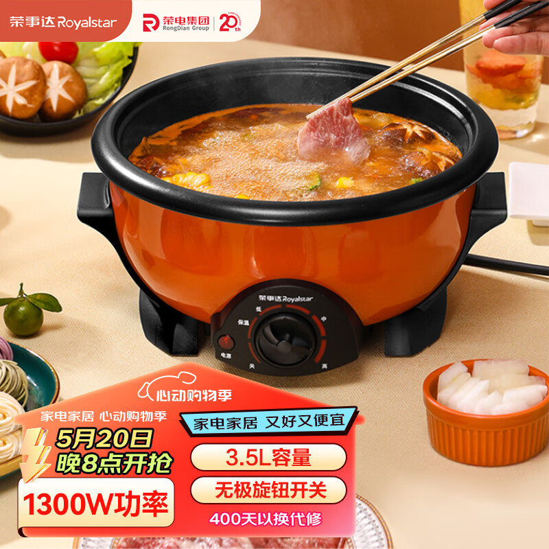 荣事达(Royalstar) 电火锅 分体电火锅 3.5L电热锅 易清洗 多用锅 电煮锅家用 RHG-35F价格:109.00元!