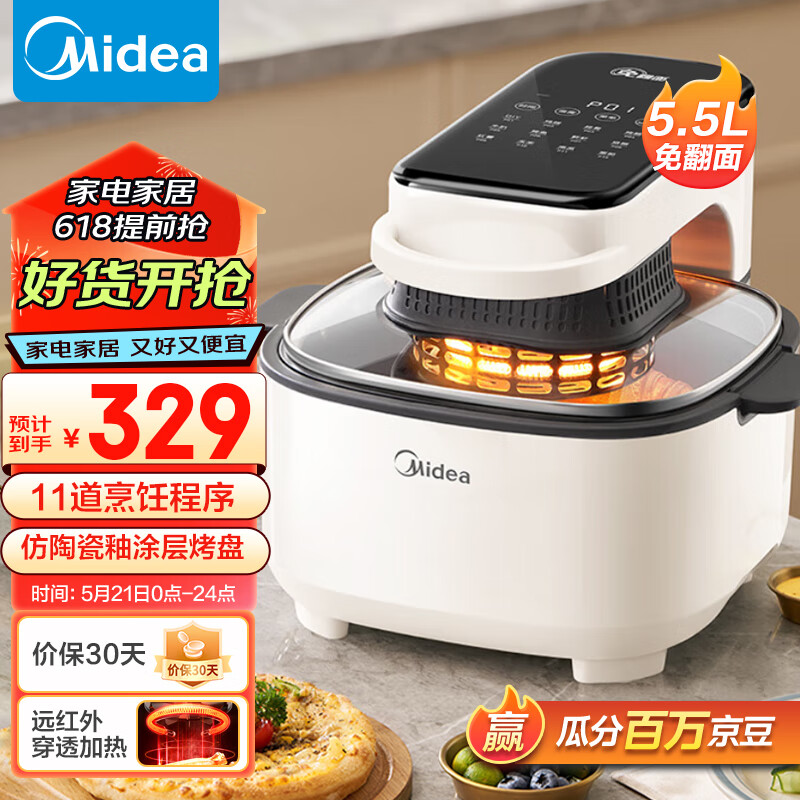美的(Midea)空气炸锅 免翻面 可视 家用大容量 5.5L 炸烤箱一体 多功能 不沾易洗 不用翻面 MF-KZC551J5价格:369.00元!