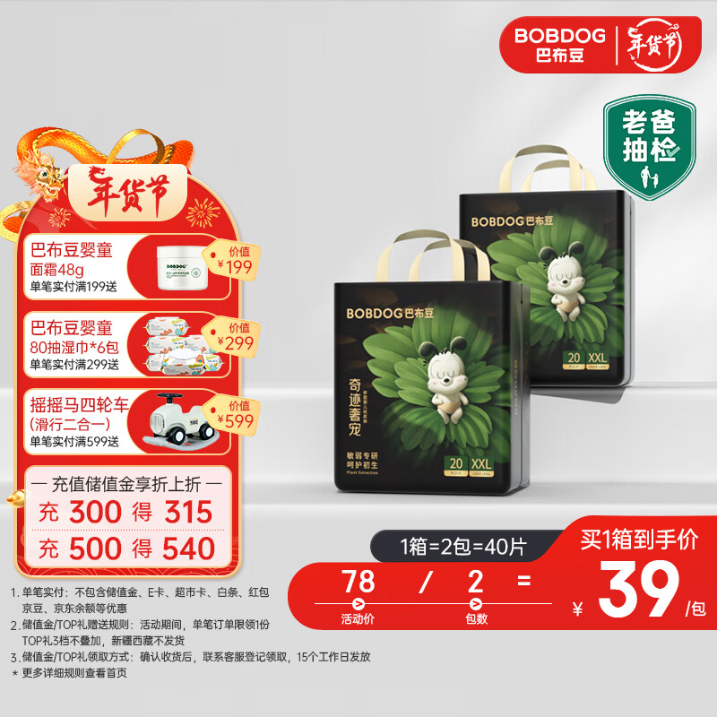 巴布豆(BOBDOG)【老爸】奇迹奢宠婴儿拉拉裤XXL码40片(14-17kg)植萃舒敏价格:78.00元!