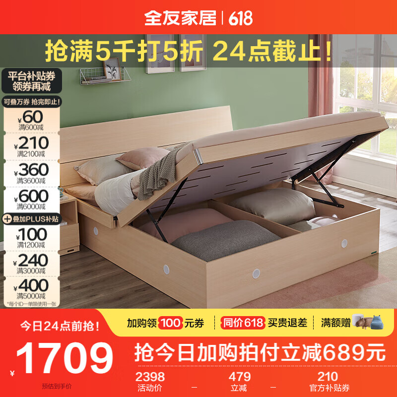 全友家居 现代简约双人床主卧室床家具1.8x2米高箱储物板式床106302价格:2398.75元!