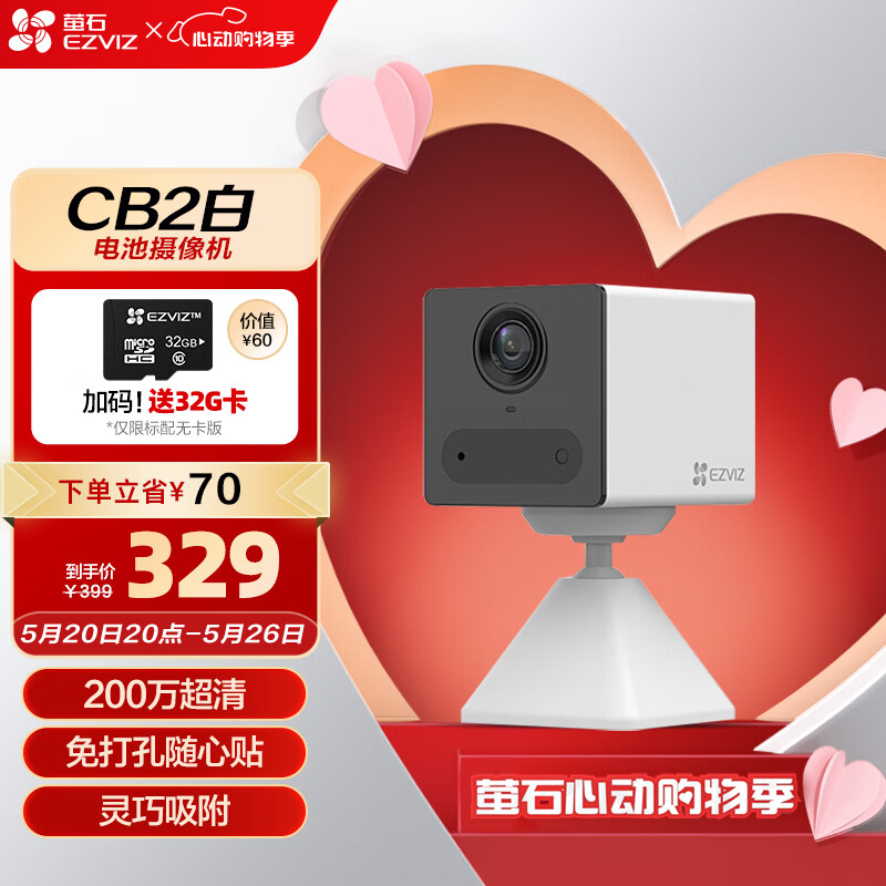 萤石 CB2 全无线监控摄像头 200万像素1080P电池相机 网络摄像机 免打孔 灵巧吸附 冰川白价格:329.00元!