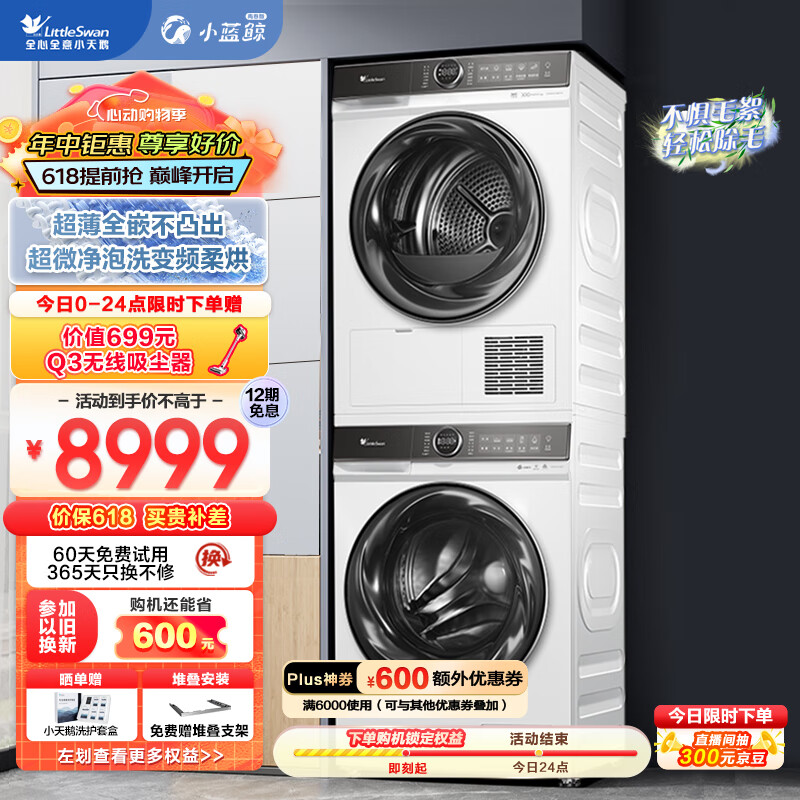 小天鹅(LittleSwan)洗烘套装10KG滚筒洗衣机全自动+热泵烘干机 超薄全嵌 超微净泡【小蓝鲸青春版】TG100VC807+807W价格:8999.00元!