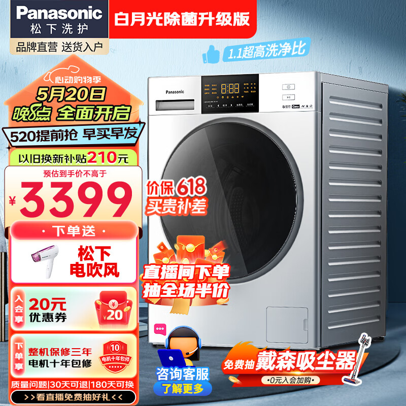 松下(Panasonic)洗衣机滚筒全自动10公斤大容量泡沫净 光动银常温除菌 BLDC变频电机节能导航【白月光除菌升级版】 XQG100-NVAE【光动银除菌】价格:3499.00元!