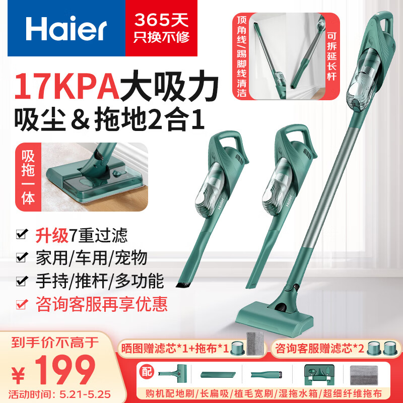 海尔(Haier) 吸尘器家用吸尘有线手持推杆除尘机大功率轻机身吸拖一体机HZ-SQ1价格:168.00元!