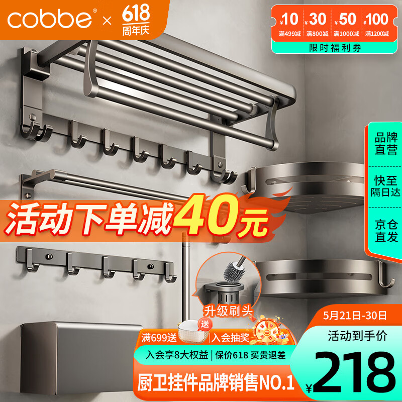 卡贝(cobbe)浴室毛巾架免打孔枪灰色太空铝卫生间置物架厕所洗手间浴巾架套装价格:258.00元!