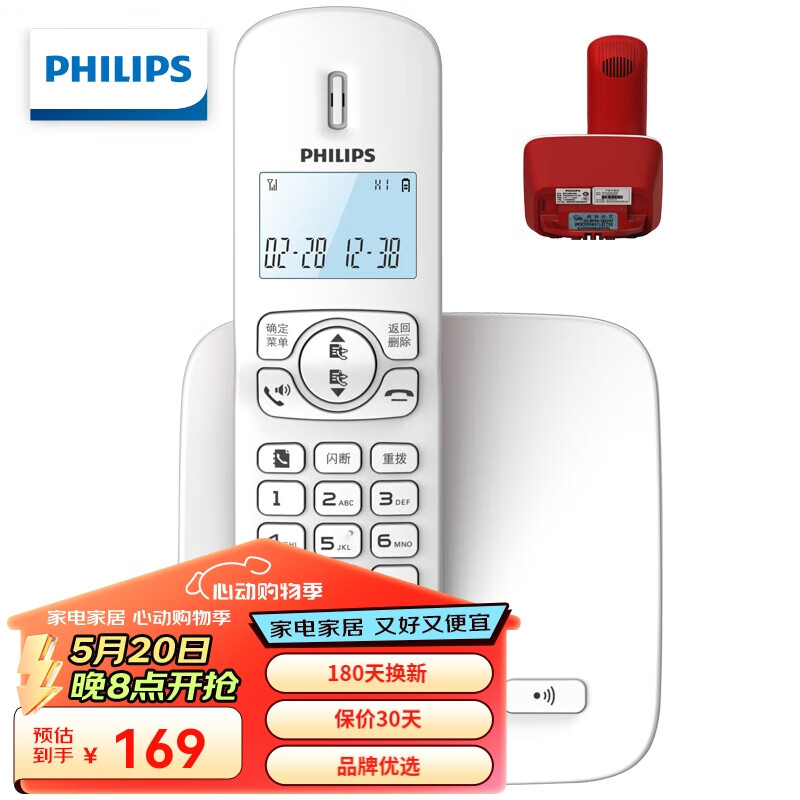 飞利浦(PHILIPS)无绳电话机 无线座机 子母机 办公家用 屏幕白色背光 持久待机 DCTG186红色价格:169.00元!