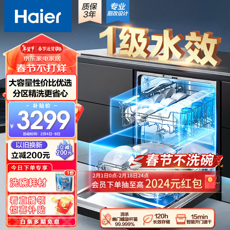 海尔(Haier)15套大容量嵌入式家用晶彩洗碗机W20洗消一体 一级水效 分区精洗开门速干EYW152286BK价格:3299.00元!