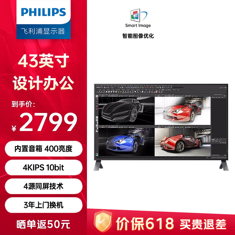 飞利浦(PHILIPS)43英寸办公显示器 4K超清 IPS屏 10bit PBP多视窗 内置音箱 HDMI+DP+VGA 设计电脑显示屏 438P1价格:2799.00元!