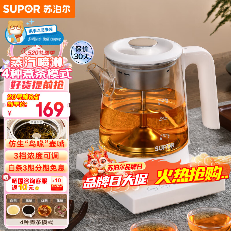 苏泊尔(SUPOR)养生壶 煮茶器大容量蒸汽喷淋式煮茶壶烧水壶 电热水壶花茶壶蒸茶器 SW-10C12【茶汤分离】价格:169.00元!