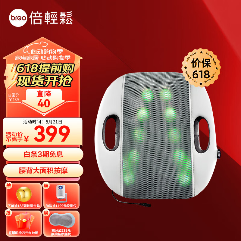 倍轻松(breo)腰部按摩器BM-312按摩垫靠垫 背部按摩器按摩仪揉捏热敷 腰背按摩器 送父母男女友520情人节礼物价格:399.00元!