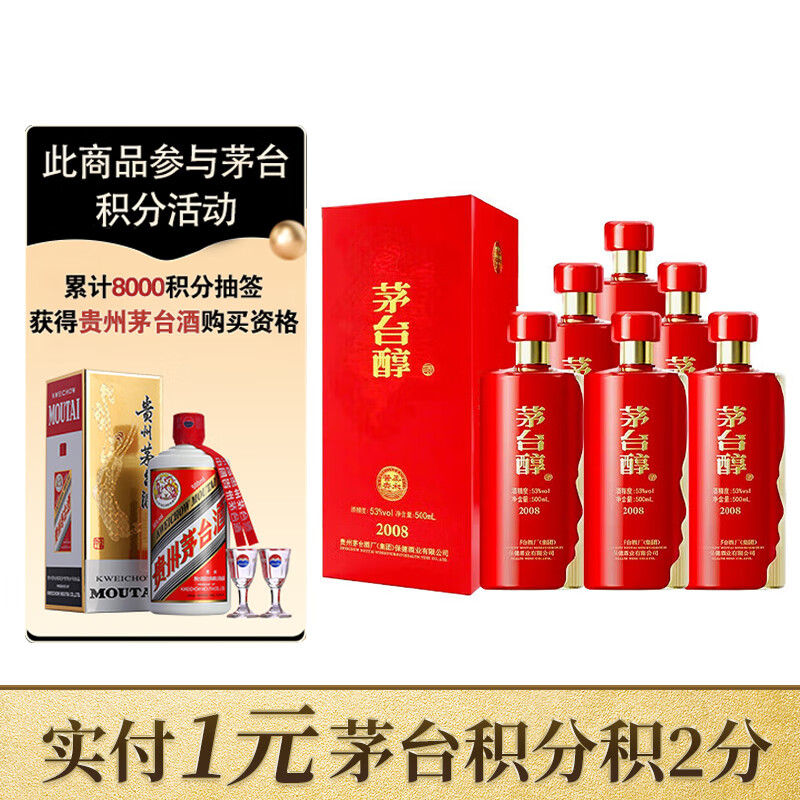 茅台(MOUTAI)茅台醇2008 酱香型白酒 53度 500ml*6 整箱装 新老包装随机发货价格:335.00元!
