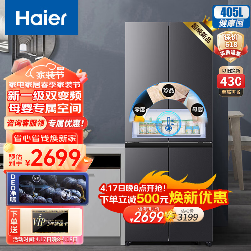 海尔(Haier)冰箱十字对开门多门四门 一级能效风冷无霜电冰箱405升母婴超薄智能双变频 BCD-405WLHTDEDS9U1价格:3847.00元!