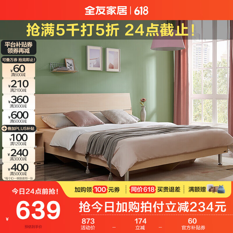 全友家居 双人床家用高脚床板式床现代简约主卧室床1.5x2米家具106302价格:873.75元!