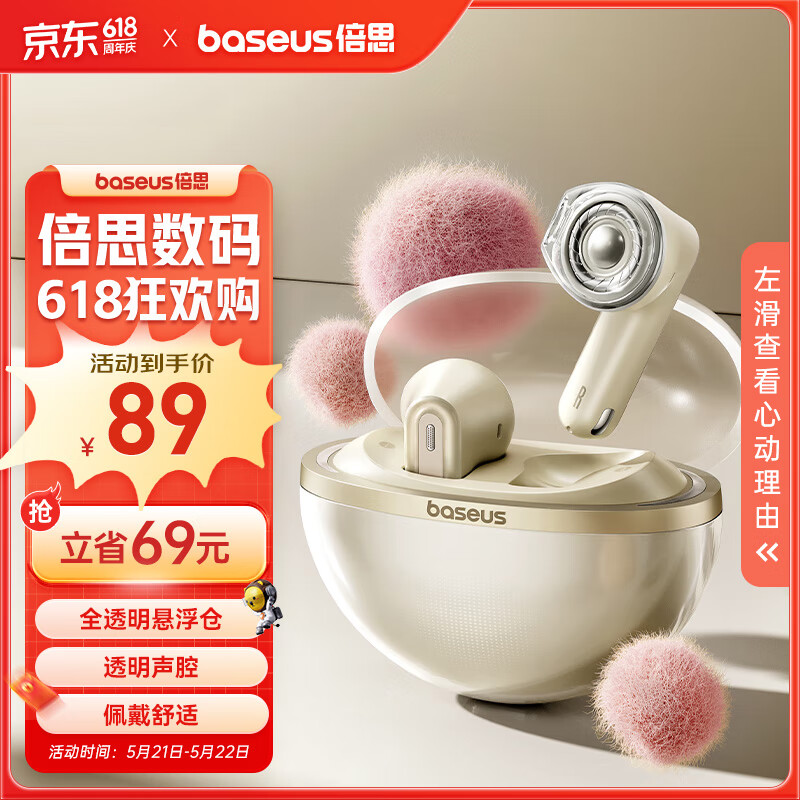 倍思 E5 真无线蓝牙耳机 半入耳舒适佩戴 通话降噪长续航蓝牙5.3音乐透明风耳机适用苹果华为小米 白价格:159.00元!